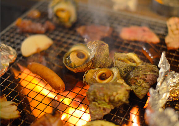 今夜のメインイベントは貸し別荘のテラスで楽しむBBQ。熱々の飛騨牛を頬張りながら、ビールで乾杯!