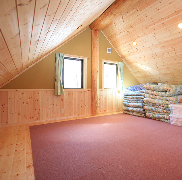 無垢の丸太が織りなす、木のぬくもりと力強さを堪能できる広々した空間。